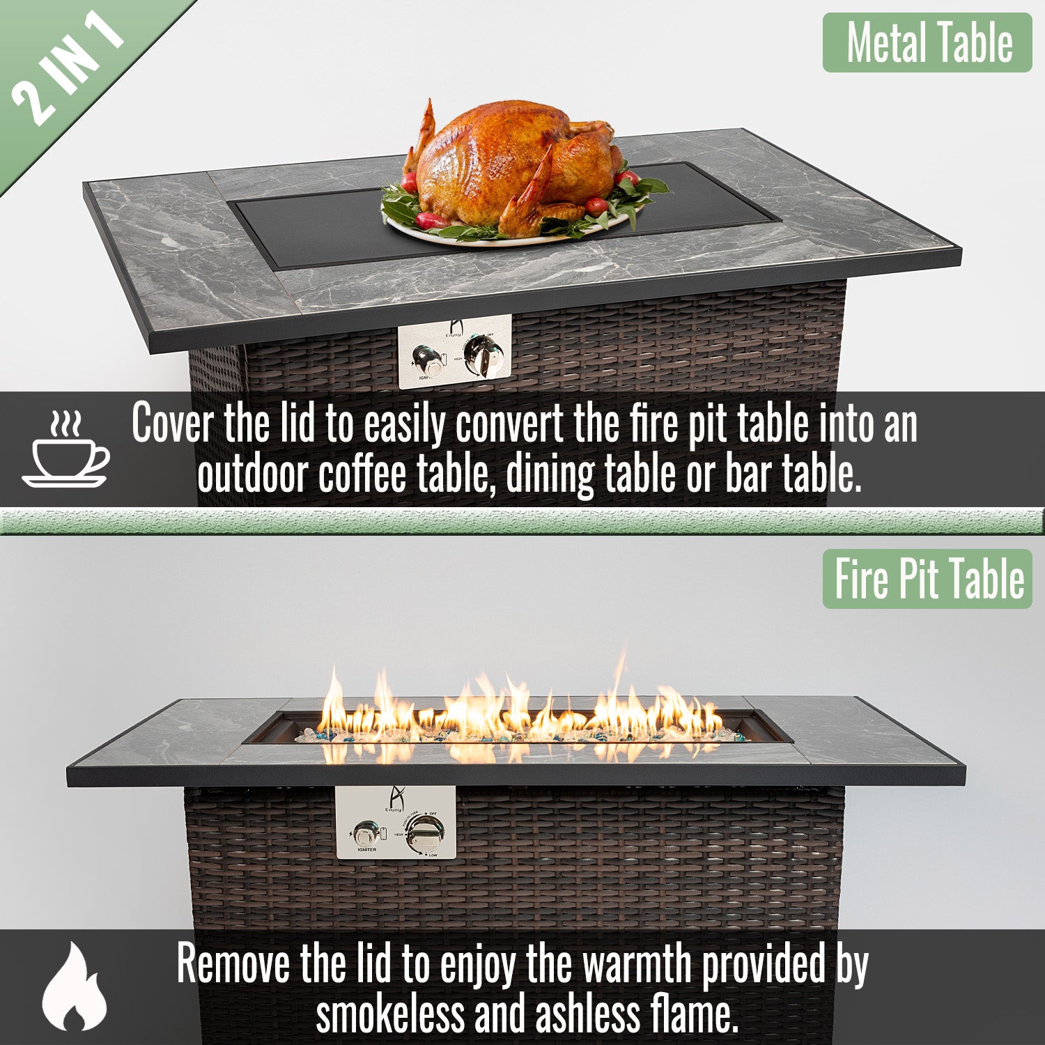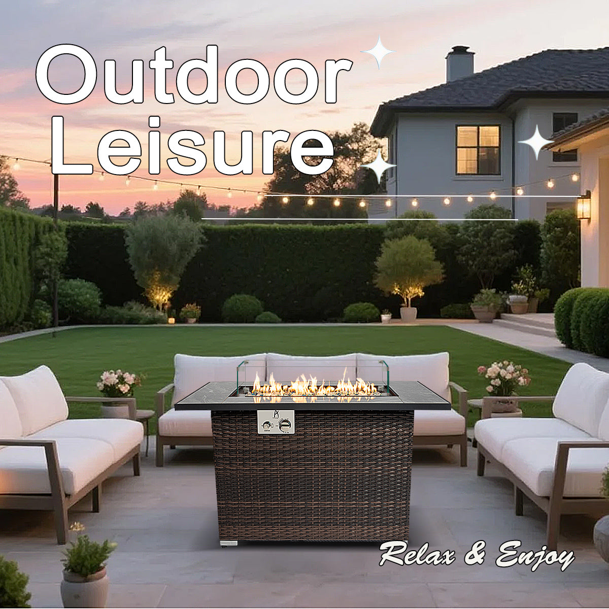 【Fashion Appearance】This rectangular fire pit table perfectly combines versatility and modern style, featuring a gorgeous 0.394-inch thick all-weather marble textured tile tabletop and wicker side panels, the tabletop is surrounded by steel edges for better protection, rated at 50,000 BTU heat output, perfect for your garden, backyard, patio, courtyard and balcony. Please be mindful of installing it on the floors in a ventilated space.
