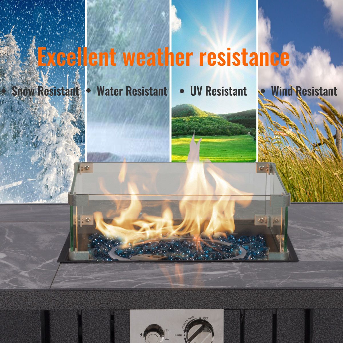 【Fashion Appearance】This square fire pit table perfectly combines versatility and modern style, featuring a gorgeous 0.394-inch thick all-weather marble textured tile tabletop, the tabletop is surrounded by steel edges for better protection, rated at 50,000 BTU heat output, perfect for your garden, backyard, patio, courtyard and balcony. We use glass wind guard to keep the flame safe and beautiful. Please be mindful of installing it on the floors in a ventilated space.
