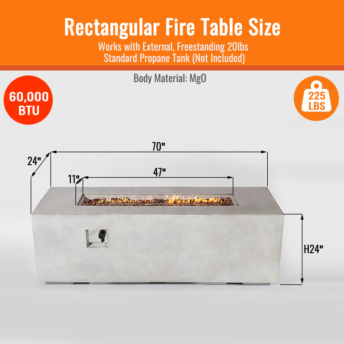70" Rectangular Concrete Propane/Natural Fire Pit Table, Outdoor Fire Pit Table with Lid, 60,000BTU. Fire pit table can be safely placed on the wooden decks or composite decks. The propane tank can be hidden inside the fire pit table.