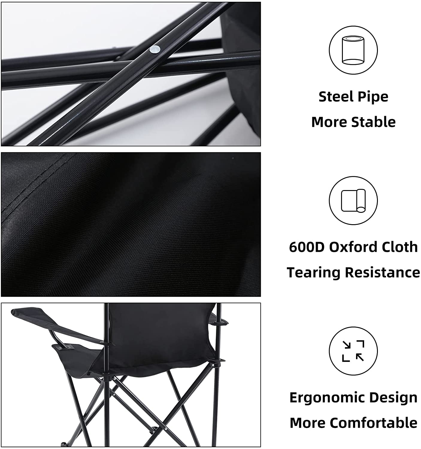 - Lightweight & Extra Strong Frame - Constructed of thick-walled steel tubing and 600D oxford tear resistant fabric. Only 3.75 pounds folding chair supports above general adult weight.